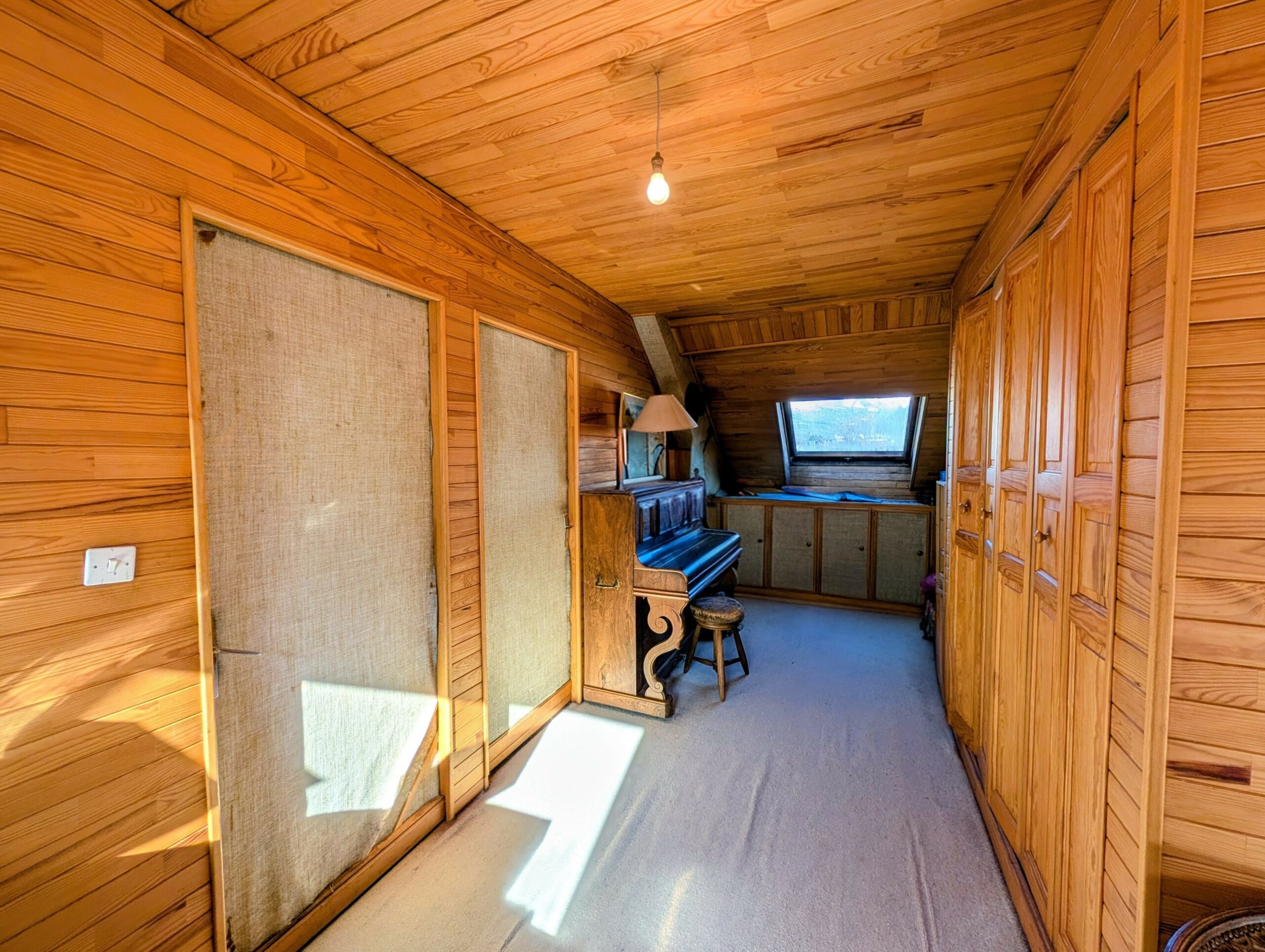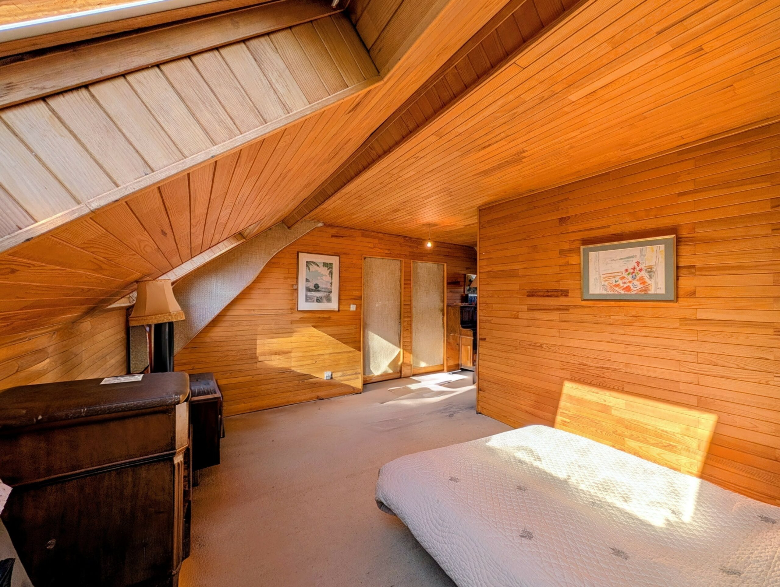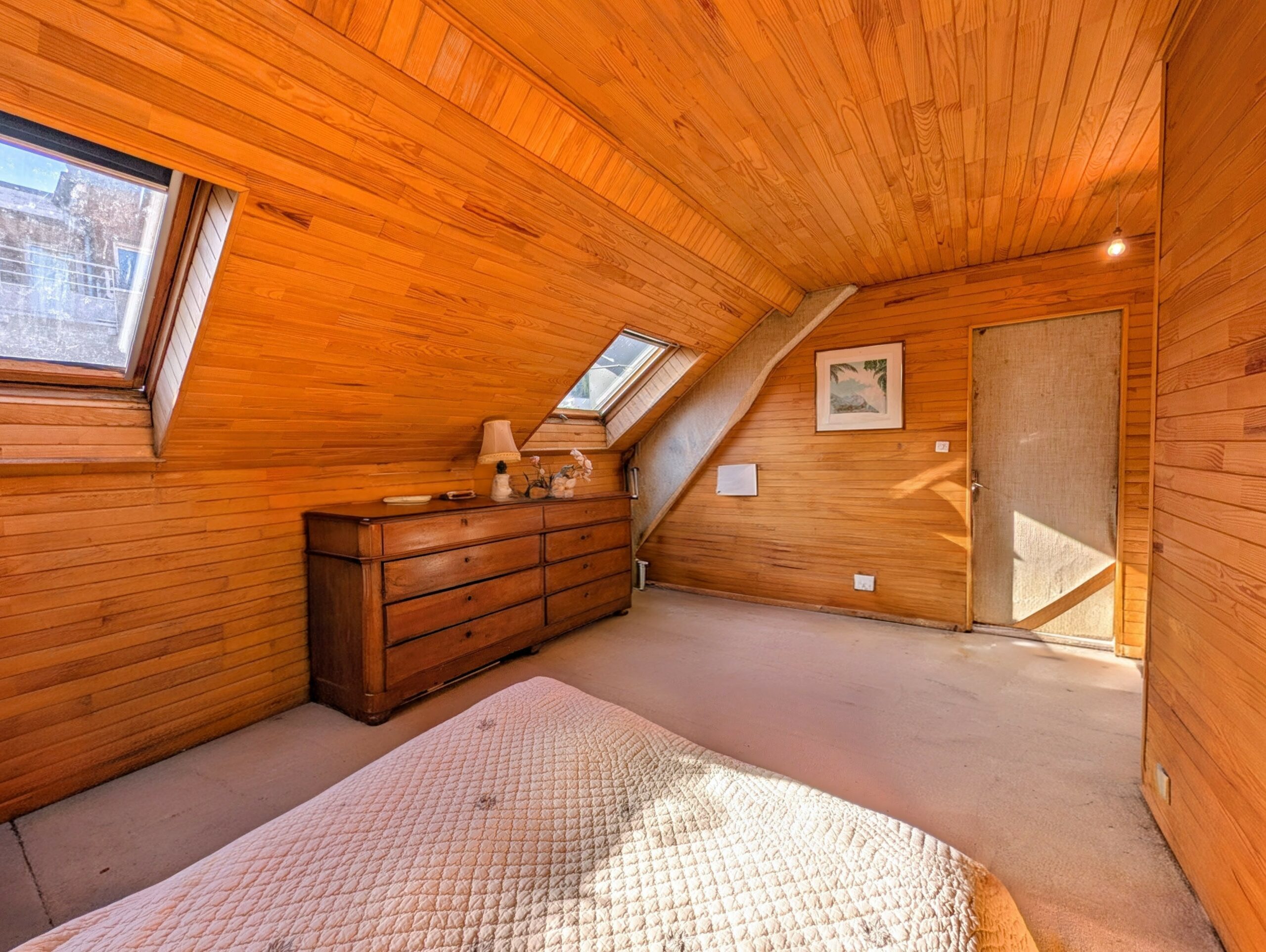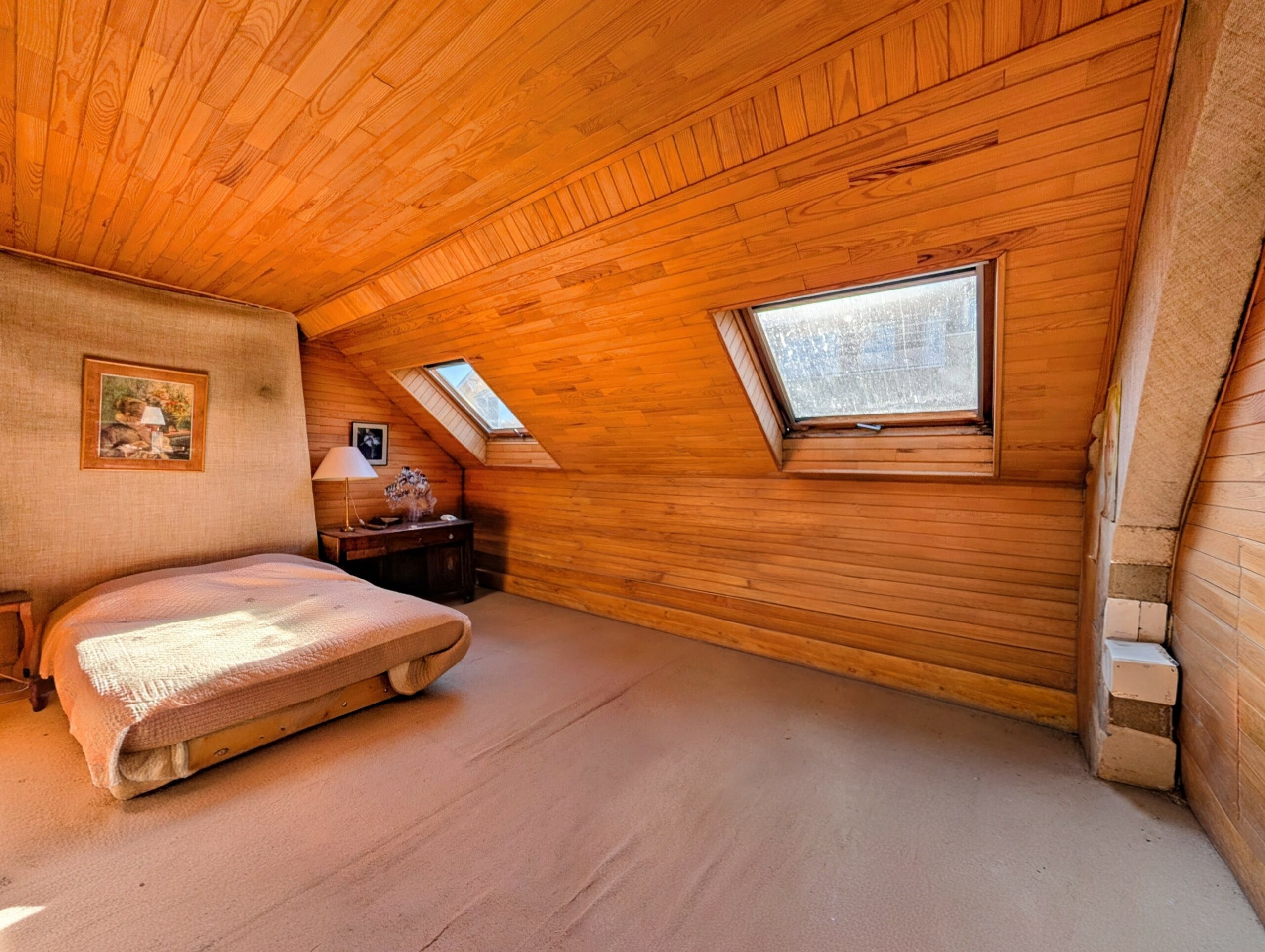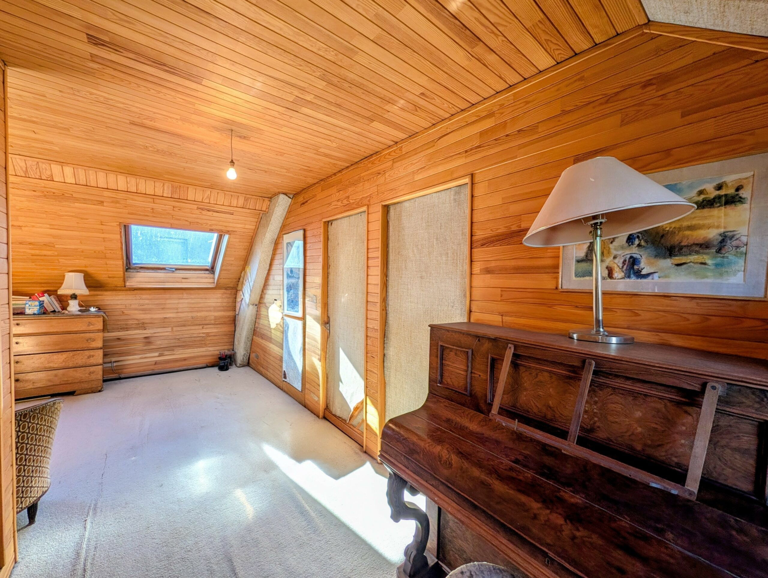 Côté opposé, deux chambres en enfilade de 13,8 m² et 13,9 m². Au bout du séjour, une grande pièce à usage de chambre ou de bureau d’une superficie de 20,3 m² mansardée.