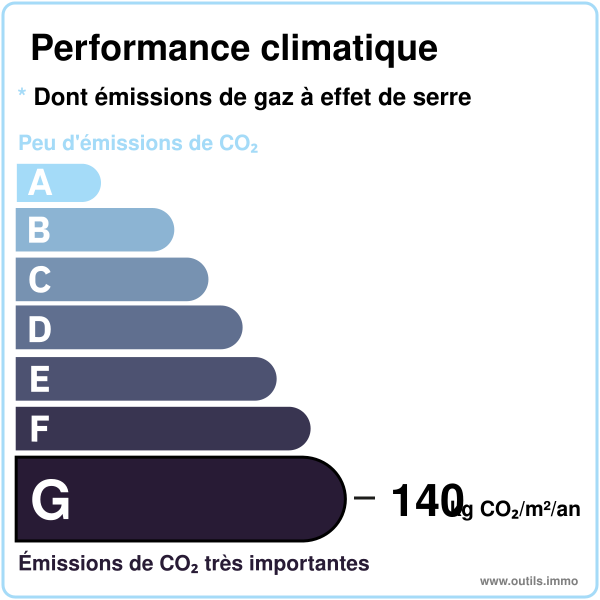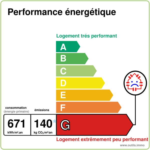 DPE réalisé le 20.01.2026 – Classe G (671 kWh/m²/an en énergie primaire et 630 kWh/m²/an en énergie finale) – Estimation des couts annuels d’énergie entre  € et  € par an (prix moyens des énergies indexés sur les années 2021, 2022 et 2023).